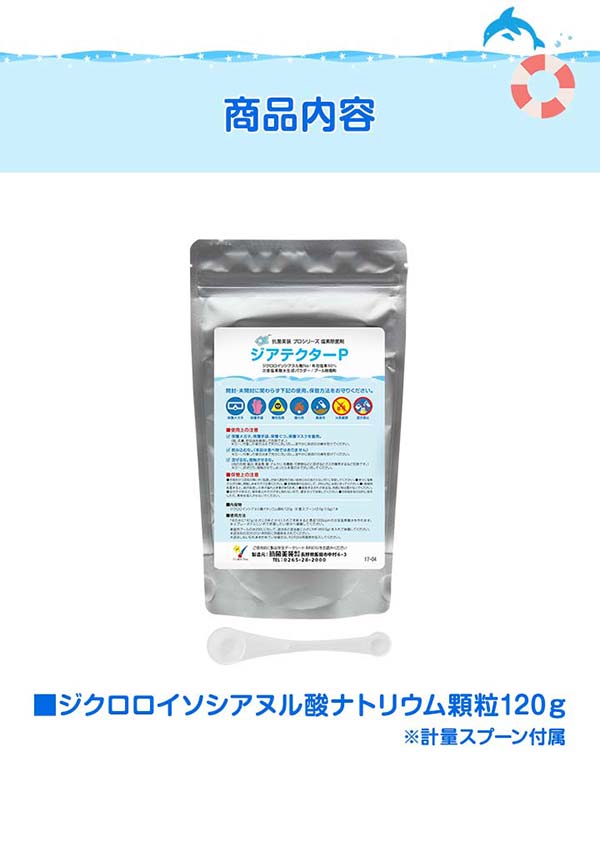 内容物:ジクロロイソシアヌル酸ナトリウム顆粒120g(60g×2袋) 計量スプーン(2.0g・0.5g)1本 使用方法(プール用の除菌剤としてお使いの場合):家庭用プールの水200Lに対して、遊泳前と遊泳後に小さじ1杯(約0.5g)を入れて除菌して下さい。